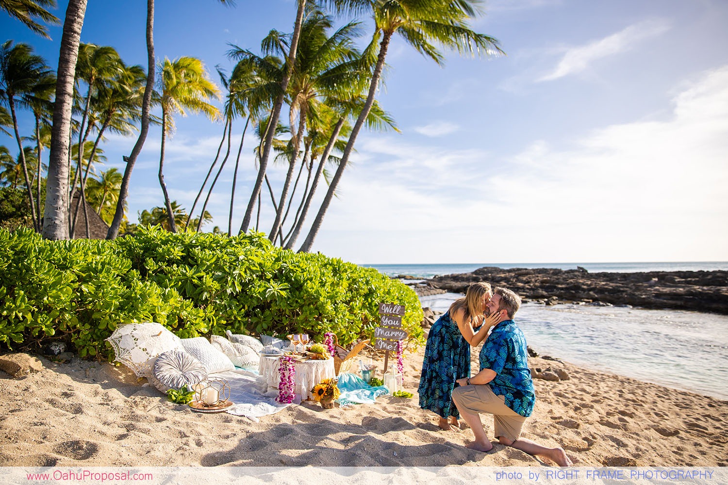 Sunset Picnic Proposal at Paradise Cove Beach in Ko'Olina, Oahu